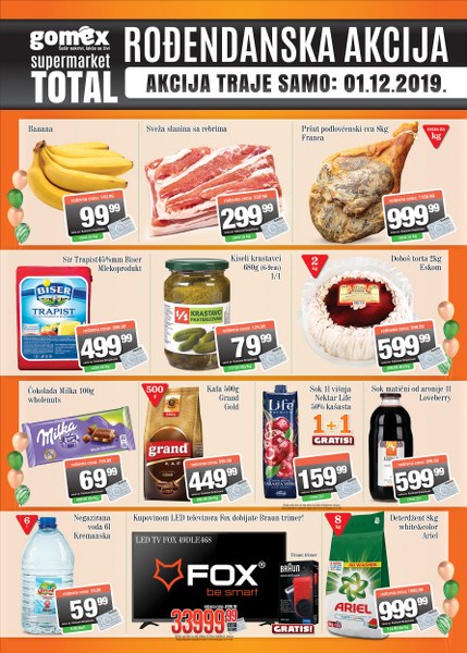 U nedelju, 1. decembra, potrošači će imati priliku da uz Kasicu-Brojalicu kupe artikle na specijalnom rođendanskom popustu, a osim toga, najavljen je i dolazak preko dvadeset dobavljača koji će raditi promocije i degustacije. Obezbeđeni su i prigodni pokloni za kupce, te će ovo biti jedan od retkih rođendana gde gosti ne donose, već dobijaju poklone. Rođendan supermarketa Gomex Total dodatno će uveličati Imlek, Zlatiborac, Doncafe, Somboled, Topola, Dijamant, Vinarija Čoka, Don Don, Haribo, Mlekoprodukt, Albus, Unijapak, Golden Rose i mnogi drugi…