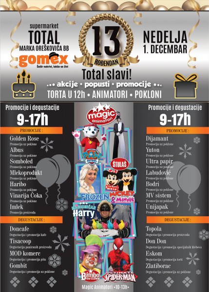 Zrenjanin- Supermarket GOMEX TOTAL, u nedelju 1. decembra, zajedno sa svojim potrošačima, proslaviće trinaestu godišnjicu poslovanja. Rođendansku zabavu obeležiće brojni popusti, promocije, degustacije i pokloni, kao i zabava za najmlađe, ali i neizbežna rođendanska torta koja će tačno u podne biti poslužena kupcima.