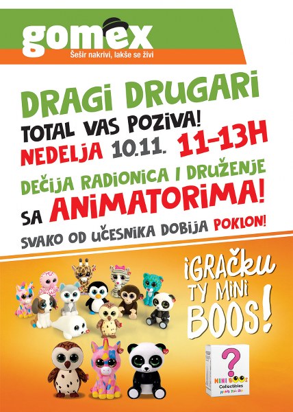 Zrenjanin- U nedelju, 10. novembra u periodu od 11 do 13 časova, samo u objektu Gomex Total najmlađe sugrađane očekuje MINI BOOS, dečja radionica i druženje sa animatorima. Svaki učesnik dobija poklon!