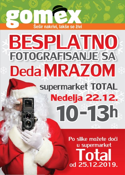 Zrenjanin- Kompanija “Gomex“ je za najmlađe sugrađane spremio lepo iznenađenje pred praznike. Deda Mraz vas čeka u Totalu u nedelju, 22. decembra, od 10 do 13 časova.