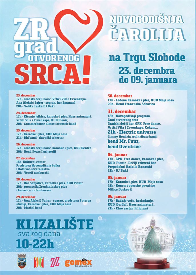 Zrenjanin- U organizaciji Grada Zrenjanina, Turističke organizacije grada i Kulturnog centra Zrenjanina, na Trgu slobode u Zrenjaninu održaće se “Novogodišnja čarolija”, prigodan program povodom novogodišnjih i božićnih praznika. Posetioce na prelepom Trgu slobode, u centru grada, očekuje klizalište, dečiji ringišpil, Snežna kugla, vašar i još mnogo toga zanimljivog.