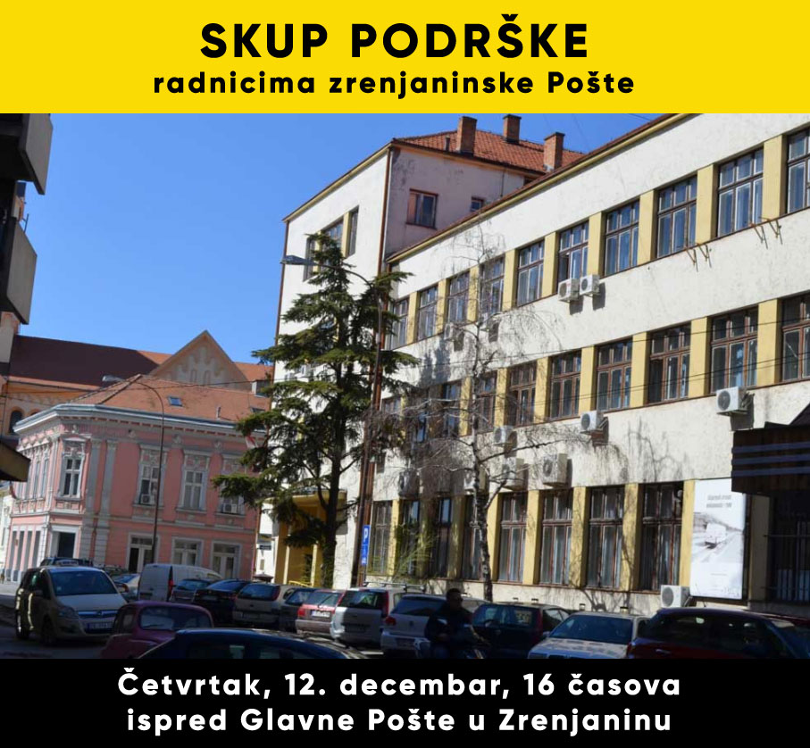SKUP PODRŠKE RADNICIMA ZRENJANINSKE POŠTE 12.12.2019. | Politika | 0 | Organizatori protesta 1 od 5 miliona pozivaju građane na skup podrške radnicima zrenjaninske Pošte koji će biti održan danas u 16 časova ispred Glavne Pošte u Zrenjaninu