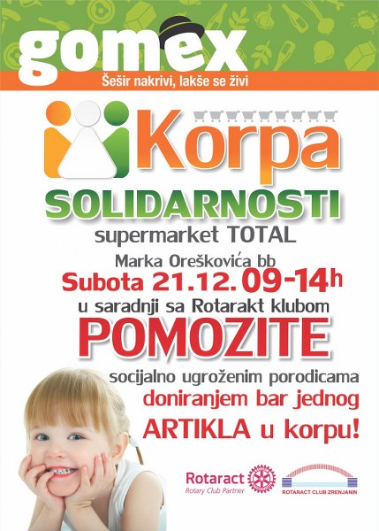 Zrenjanin- Kompanija Gomex i predstavnici Rotaract kluba iz Zrenjanina i ove godine organizuju humanitarnu akciju pod nazivom “Korpa solidarnosti”. U pitanju je akcija koja se tradicionalno organizuje dva puta godišnje, pred uskršnje i božićne praznike, a koja ima za cilj da se zajedno sa potrošačima prikupi što veći broj osnovnih životnih namirnica namenjenih socijalno ugroženim porodicama sa velikim brojem dece.