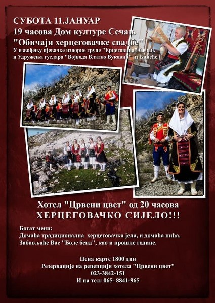 Sečanj-Tradicionalno „Hercegovačko sijelo“ biće održano u subotu, 11. januara 2020. godine , u Sečnju uz bogat program i duženje u hotelu „Crveni cvet“. Ulaz je besplatan!