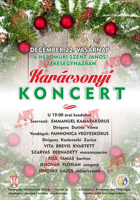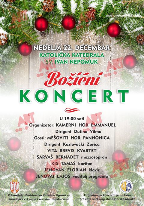 “Božićni koncert” održaće se u nedelju 22. decembra u katoličkoj katedrali Sv. Ivana Nepomuka u Zrenjaninu sa početkom u 19 sati. Ulaz je slobodan.