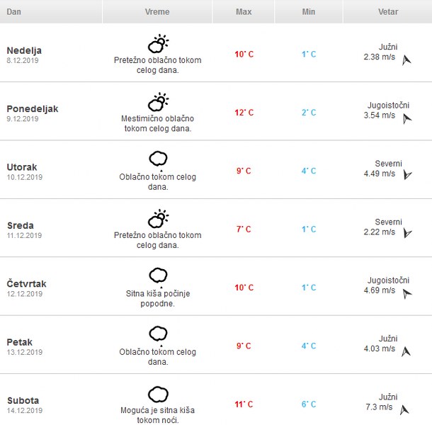 Pogledajte detaljnu vremensku prognozu za narednih sedam dana: