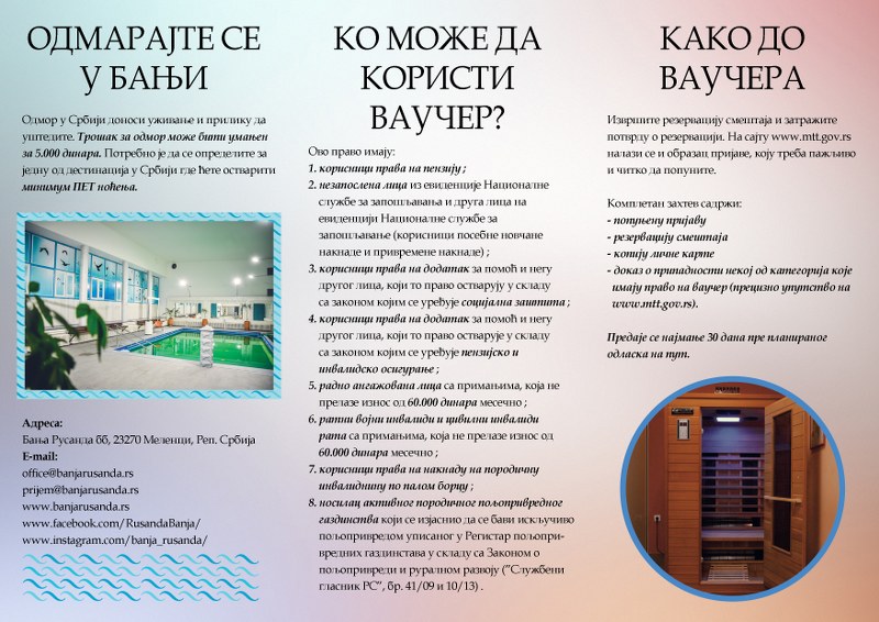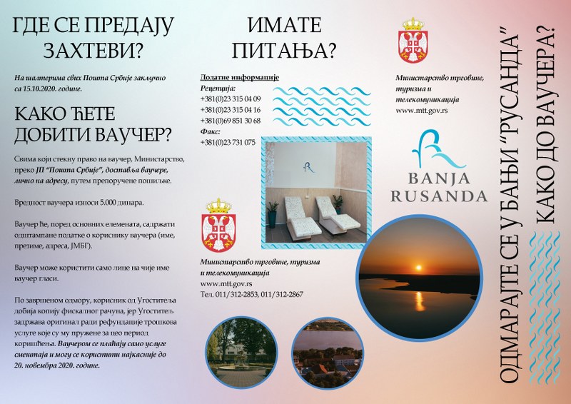 Odmor u Srbiji donosi uzivanje i priliku da uštedite. Trošak za odmor može biti umanjen za 5.000din. Potrebno je da se opredelite za jednu od destinacija u Srbiji gde ćete ostvariti minumum 5 noćenja. Jedna od ustanova za koju možete dobiti vaučer je i Banja Rusanda. Sve informacije možete pročitati u objavi na slikama ili putem poziva na navedene kontakt telefone naše ustanove.