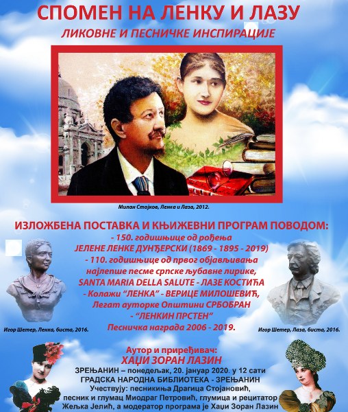 Zrenjanin- U ponedeljak, 20. januara od 12 časova u velikoj sali Gradske narodne biblioteke „Žarko Zrenjanin“ biće predstavljena izložbena postavka i književni program „Spomen na Lenku i Lazu – likovne i pesničke inspiracije“.