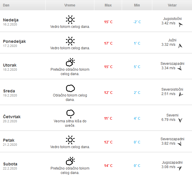 Pogledajte detaljnu vremensku prognozu za narednih sedam dana: