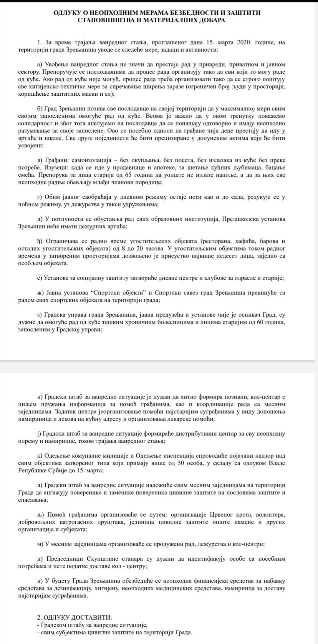 Janjić je naglasio da se mere donose s ciljem da se sačuva stanovništvo, posebno najugroženije kategorije, kao i sistem zdravstvene zaštite u Zrenjaninu, a da privreda i sve gradske službe, javna preduzeća i ustanove funkcionišu, uz prilagođavanje novonastalim okolnostima. Mere se donose na osnovu procena i ingerencija lokalne samouprave, uz poštovanje svih preporuka Vlade Republike Srbije, Kriznog štaba za suzbijanje zarazne bolesti Kovida-19 i Kriznog štaba za otklanjanje nastalih i sprečavanje mogućih štetnih posledica koronavirusa.
