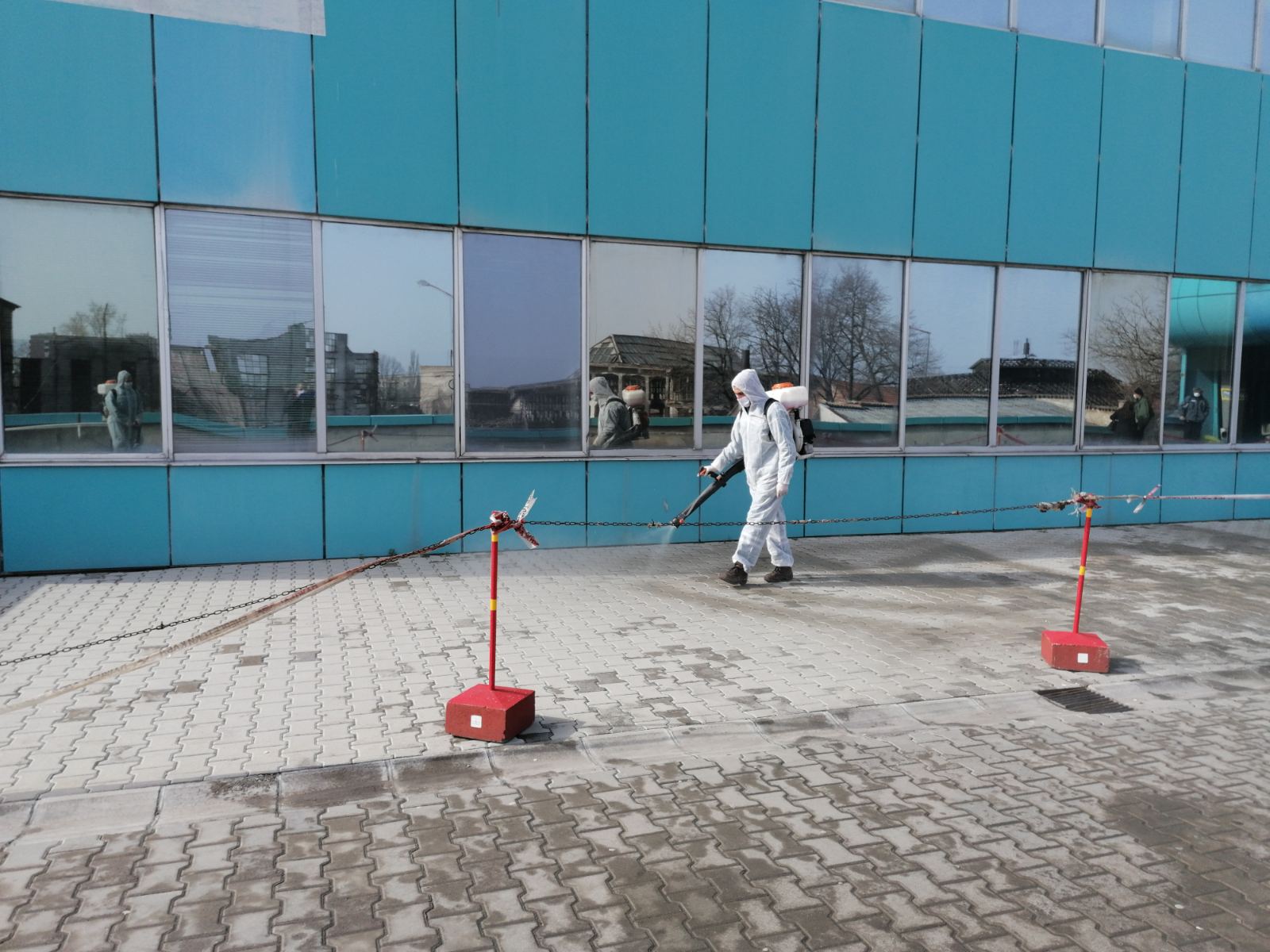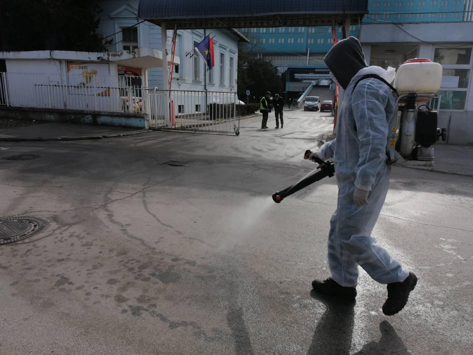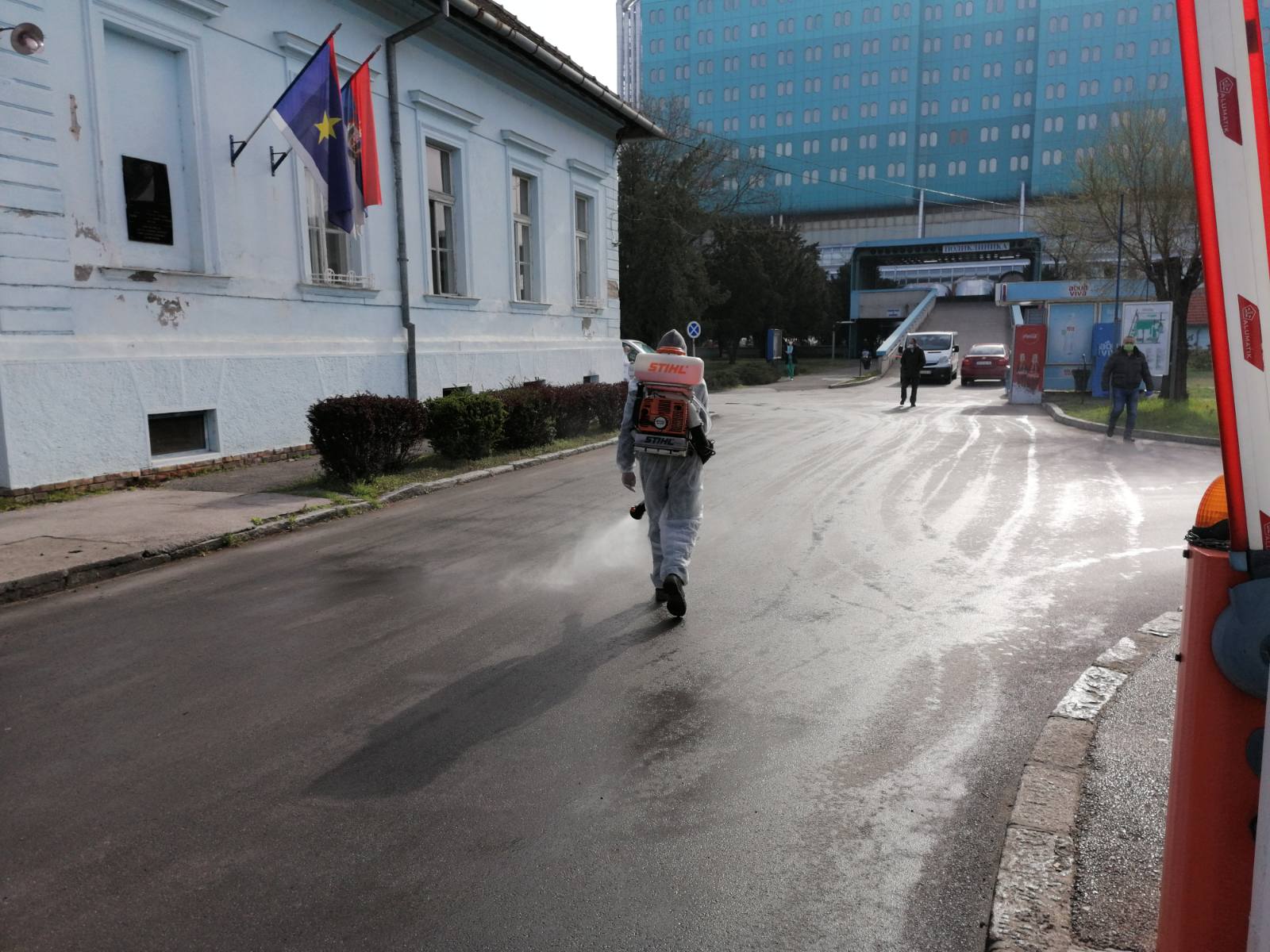 Zrenjanin- Danas su radnici JKP „Čistoća i zelenilo“ Zrenjanin intezivno radili na dezinfekciji spoljnih površina u krugu Opšte bolnice „Đorđe Joanović“ i Urgentnog centra, kao i dezinfekciju površina koje se nalaze oko njih.