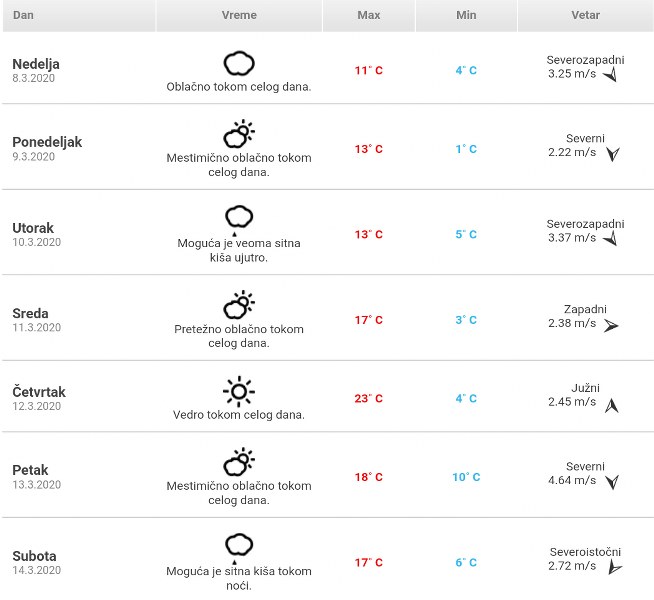 Pogledajte detaljnu vremensku prognozu za narednih sedam dana: