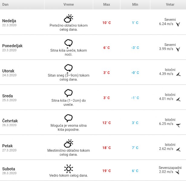 VREMENSKA PROGNOZA ZA NAREDNIH SEDAM DANA 22.03.2020. | Vesti | 0 | U Zrenjaninu će danas biti oblačno i vetroviro. Maksimalna dnevna temperatura će biti 10 stepeni. Pogledajte detaljnu vremensku prognozu za narednih sedam dana: Printscrin:navidiku.rs