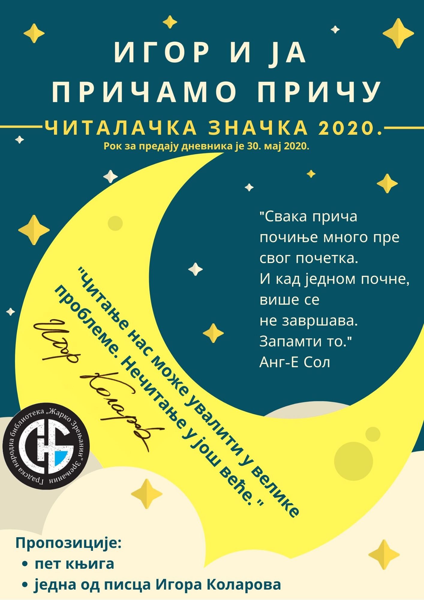 Slogan ovogodišnje „Čitalačke značke“ je „Igor i ja pričamo priču“, uz preporuku da jedna od prikazanih knjiga bude neko delo Igora Kolarova. Rok za predaju dnevnika koji je prvobitno bio 15. maja, produžen je do kraja maja.