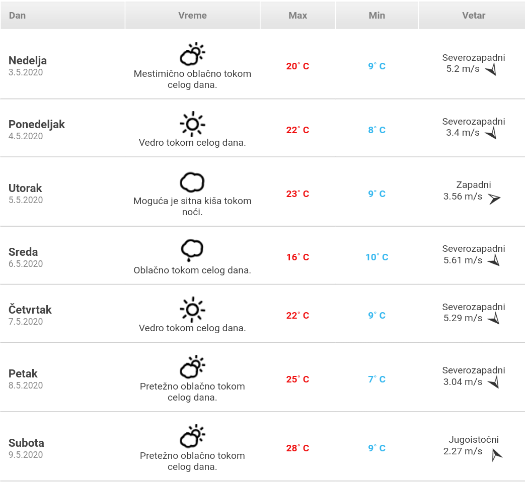 Pogledajte detaljnu vremensku prognozu za narednih 7 dana: