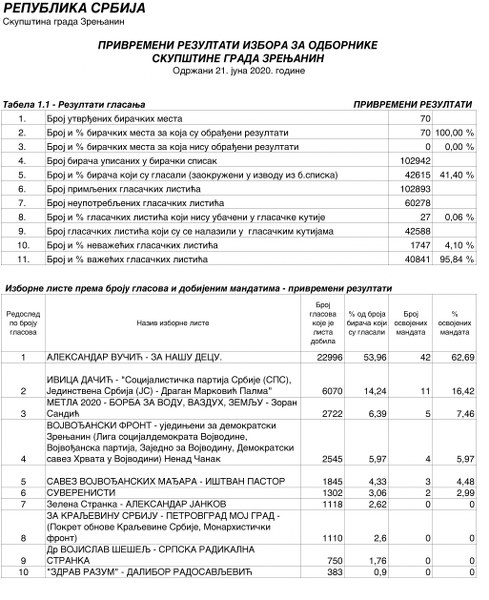 IZBORI 2020- Privremeni rezultati izbora za odbornike u Skupštini grada Zrenjanina. U Skupštini grada odbornici šest stranaka ili koalicija, SNS osvojio 42 od 67 mandata.