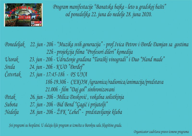 Pogledajte  program manifestacije „Banatska bajka“ u Gradskoj bašti za period od 22.  do 28. juna 2020. godine: