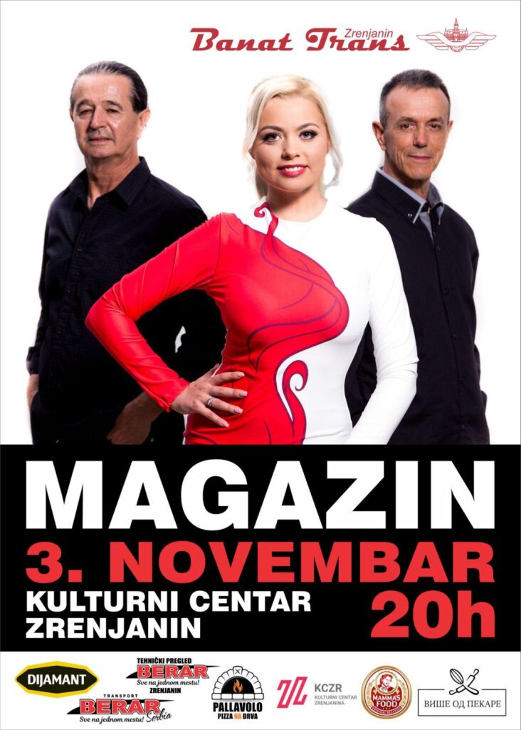 Na velikoj sceni Kulturnog centra Zrenjanina u sredu, 3. novembra biće održan koncert poznate pop grupe „Magazin“. Karte se prodaju na biletarnici Kulturnog centra od 1. oktobra, svakog radnog dana od 10 do 12 i od 18 do 20 časova. Cena ulaznice, u zavisnosti od mesta sedenja, iznosi 1300, 1500 i 2000 dinara.