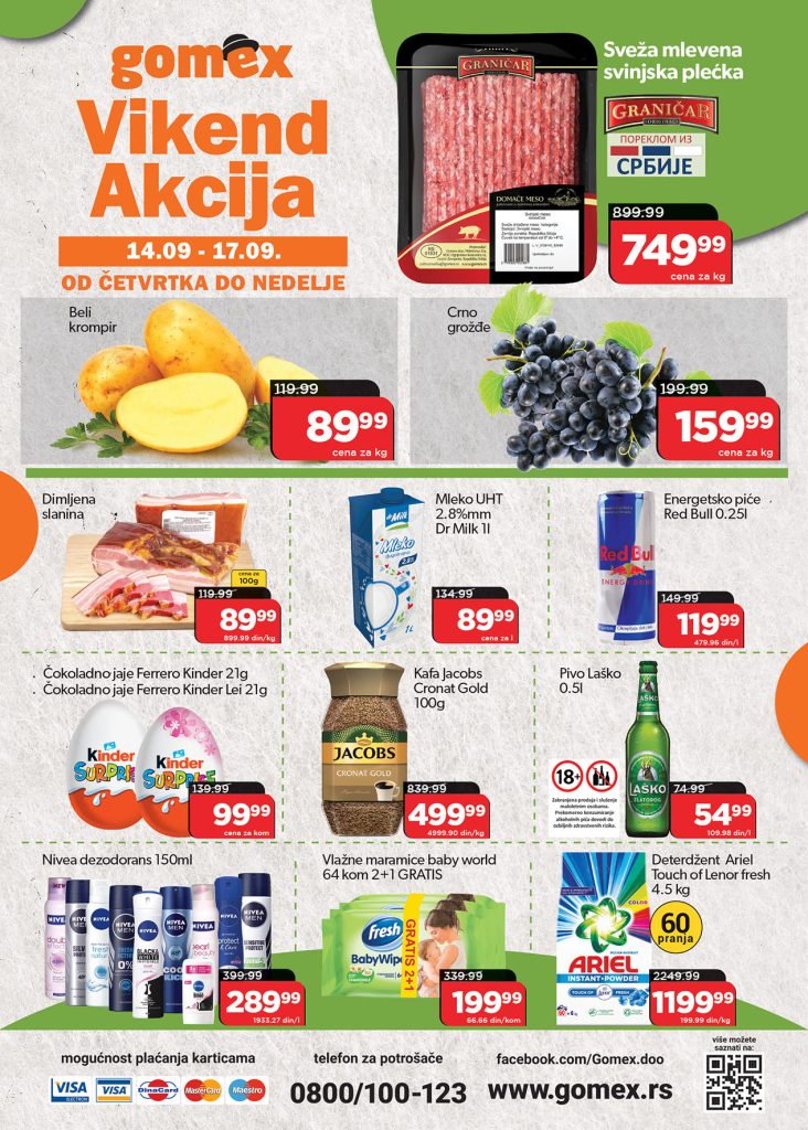 U svom omiljenom Gomexu potražite : svežu mlevenu svinjsku plećku , mladi beli krompir, crno grožđe, dimljenu slaninu, kao i ostale brendove: mleko Dr Milk ,Red Bull, Ferero Kinder jaja, kafu Jacobs Cronat Gold, Pivo Laško, Nivea dezodoranse-više vrsta, vlažne maramice Baby world, kao i deterdžent Ariel.