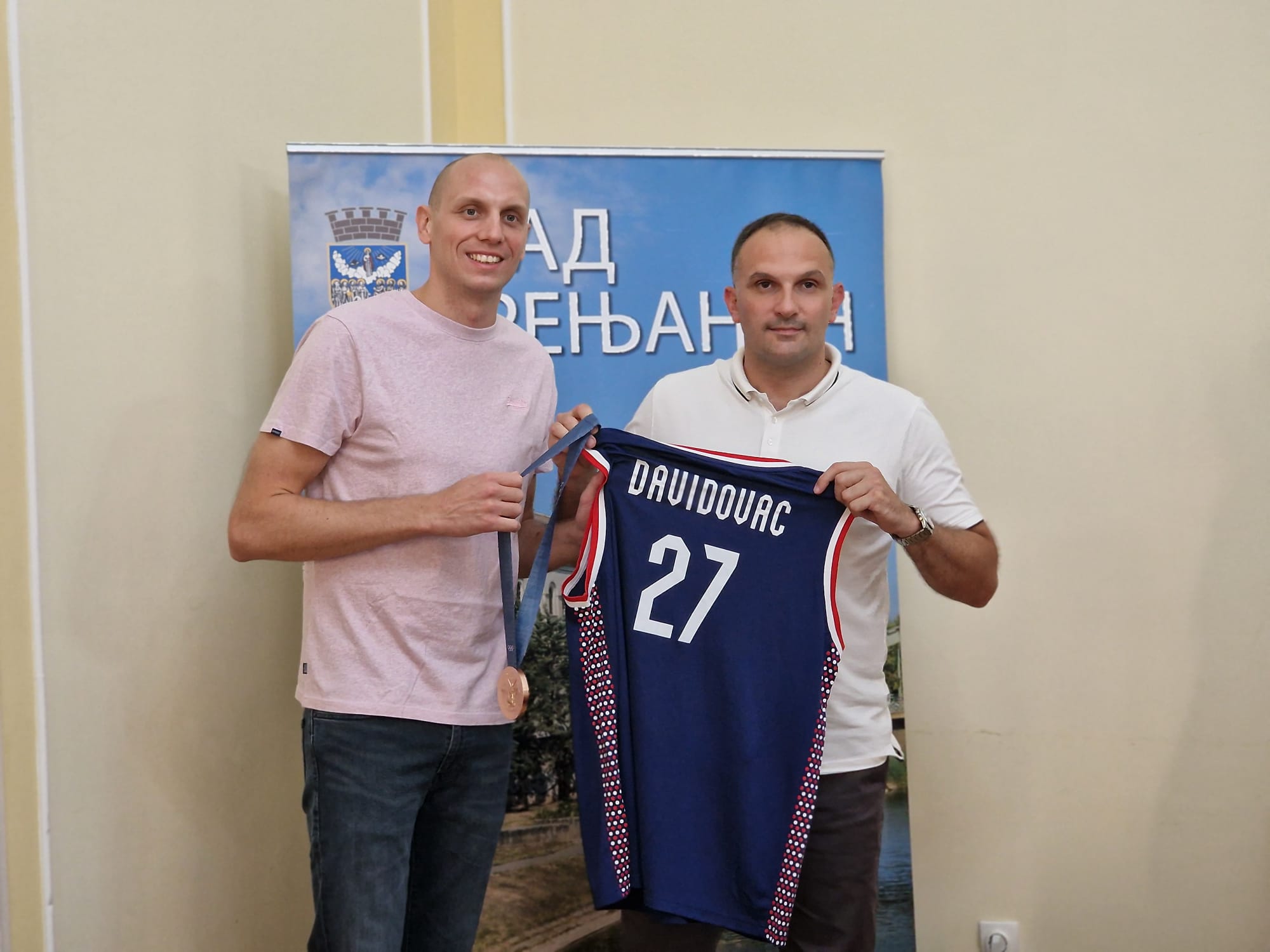 Zrenjanin- Gradonačelnik Simo Salapura, zajedno sa svojim saradnicima, organizovao je juče prijem za olimpijca iz našeg grada, košarkaša Dejana Davidovca, koji se iz Pariza vratio sa bronzanom medaljom, jubilarnom 25. medaljom za sportski i olimpijski Zrenjanin.