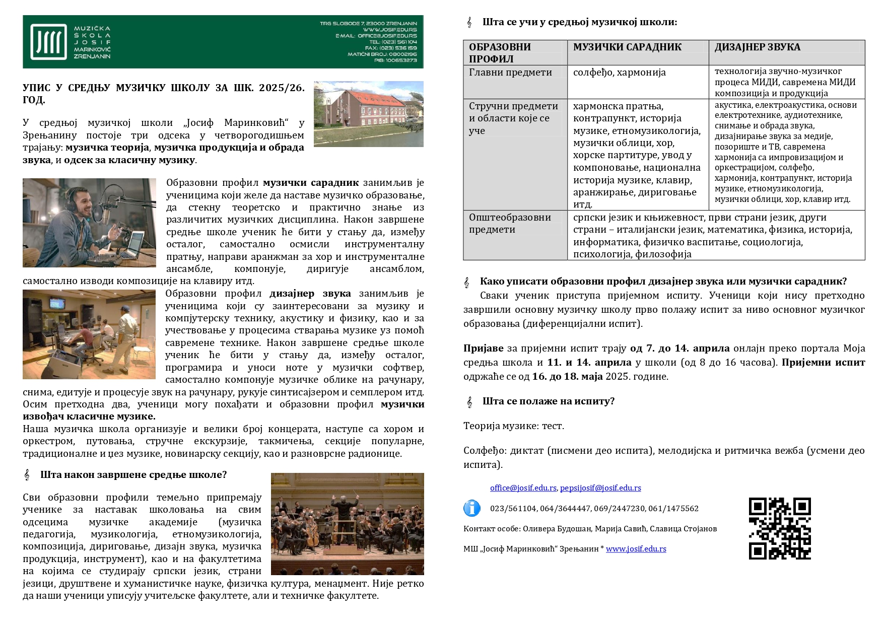 Zrenjanin- Prijave za polaganje prijemnog ispita za Srednju muzičku školu „Josif Marinković“ Zrenjanin za školsku 2025/26. godinu traju do 14. aprila onlajn preko portala www.mojasrednjaskola.gov.rs i 11. i 14. aprila neposredno u školi, od 8-16 časova.