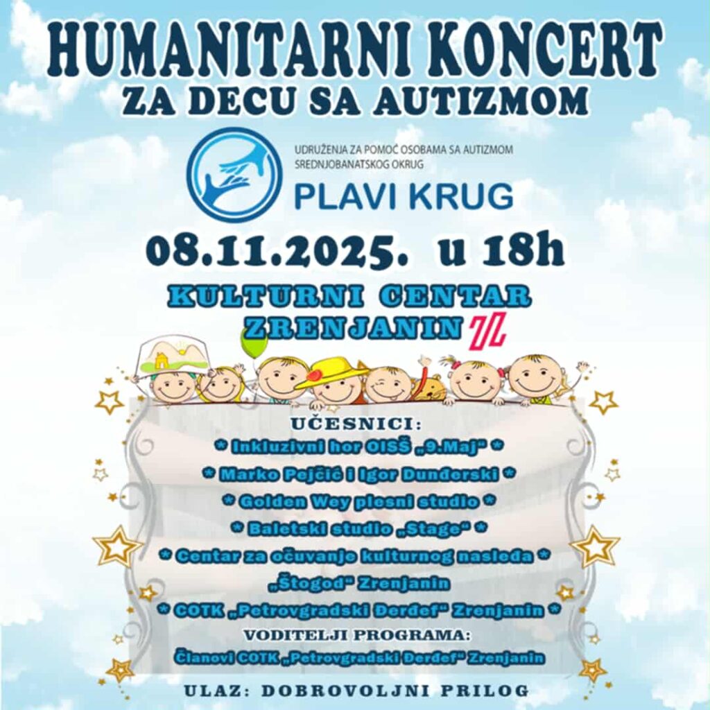 Zrenjanin- Humanitarni koncert za prostor za decu sa autizmom biće održan 08. novembra 2025. godine sa početkom u 18 časova u Kulturnom centru.