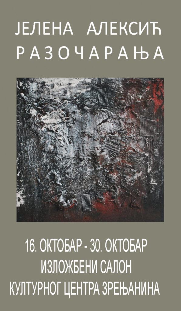 Zrenjanin- Izložba „Razočaranja“ likovne umetnice Jelene Aleksić otvara se u Kulturnom centru Zrenjanina u četvrtak, 16. oktobra u 19 časova.
