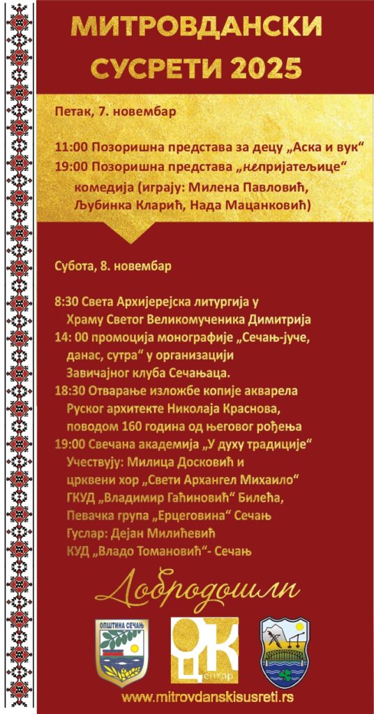 Tradicionalna manifestacija „Mitrovdanski susreti“ održaće se 7. i 8. novembra u Sečnju, najavila je direktorka Obrazovno-kulturnog centra Sečanj, Branislava Rudan. Ova višedecenijska manifestacija obeležava crkvenu slavu Svetog Dimitrija – zaštitnika mesta, kao i godišnjicu doseljavanja stanovništva iz Hercegovine u Banat, spajajući tradiciju, kulturu i umetnost.