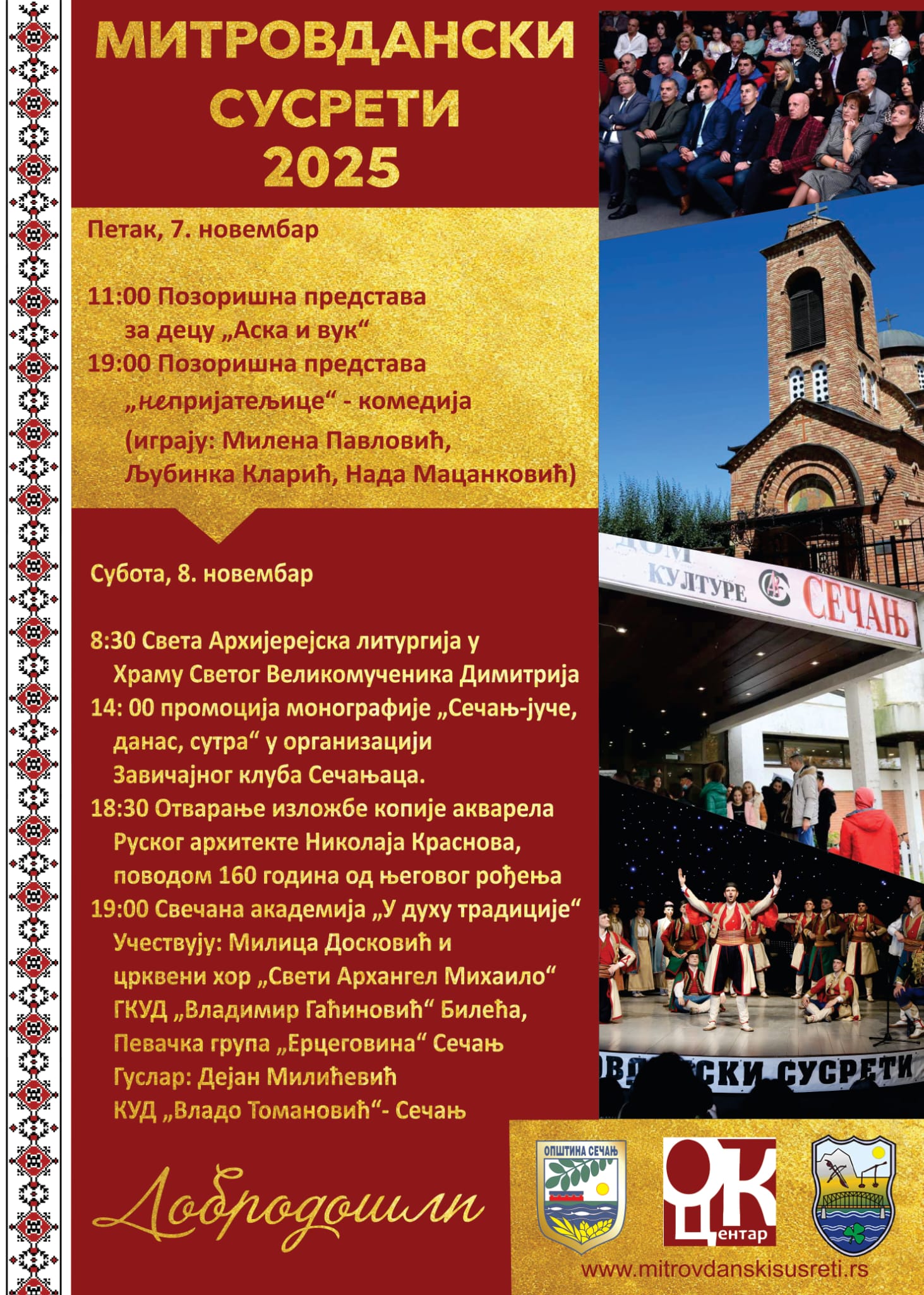 Tradicionalna manifestacija „Mitrovdanski susreti“ održaće se 7. i 8. novembra u Sečnju, najavila je direktorka Obrazovno-kulturnog centra Sečanj, Branislava Rudan. Ova višedecenijska manifestacija obeležava crkvenu slavu Svetog Dimitrija – zaštitnika mesta, kao i godišnjicu doseljavanja stanovništva iz Hercegovine u Banat, spajajući tradiciju, kulturu i umetnost.
