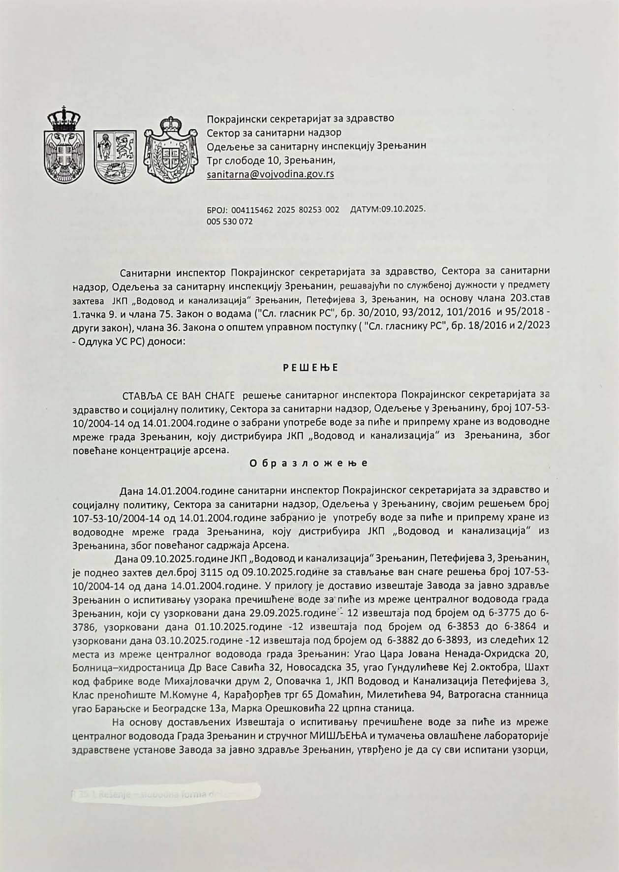 Podsetimo, 20. januara 2004. godine u Zrenjaninu je zabranjeno korišćenje pijaće vode iz gradskog vodovoda zbog nedozvoljene količine arsena.
