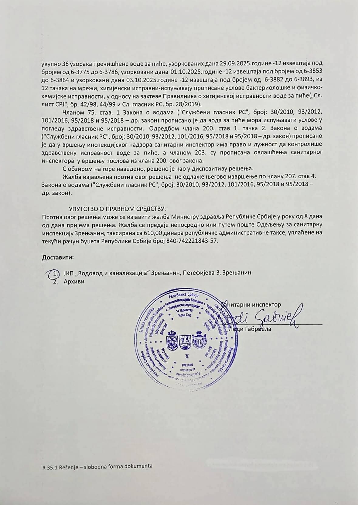 Ovo se neko igra sa zdravljem građana Zrenjanina i krši zakone, jer se tačno zna koliko meseci praćenja parametara je potrebno da bi se skinula zabrana…Ja je sigurno neću piti!!!