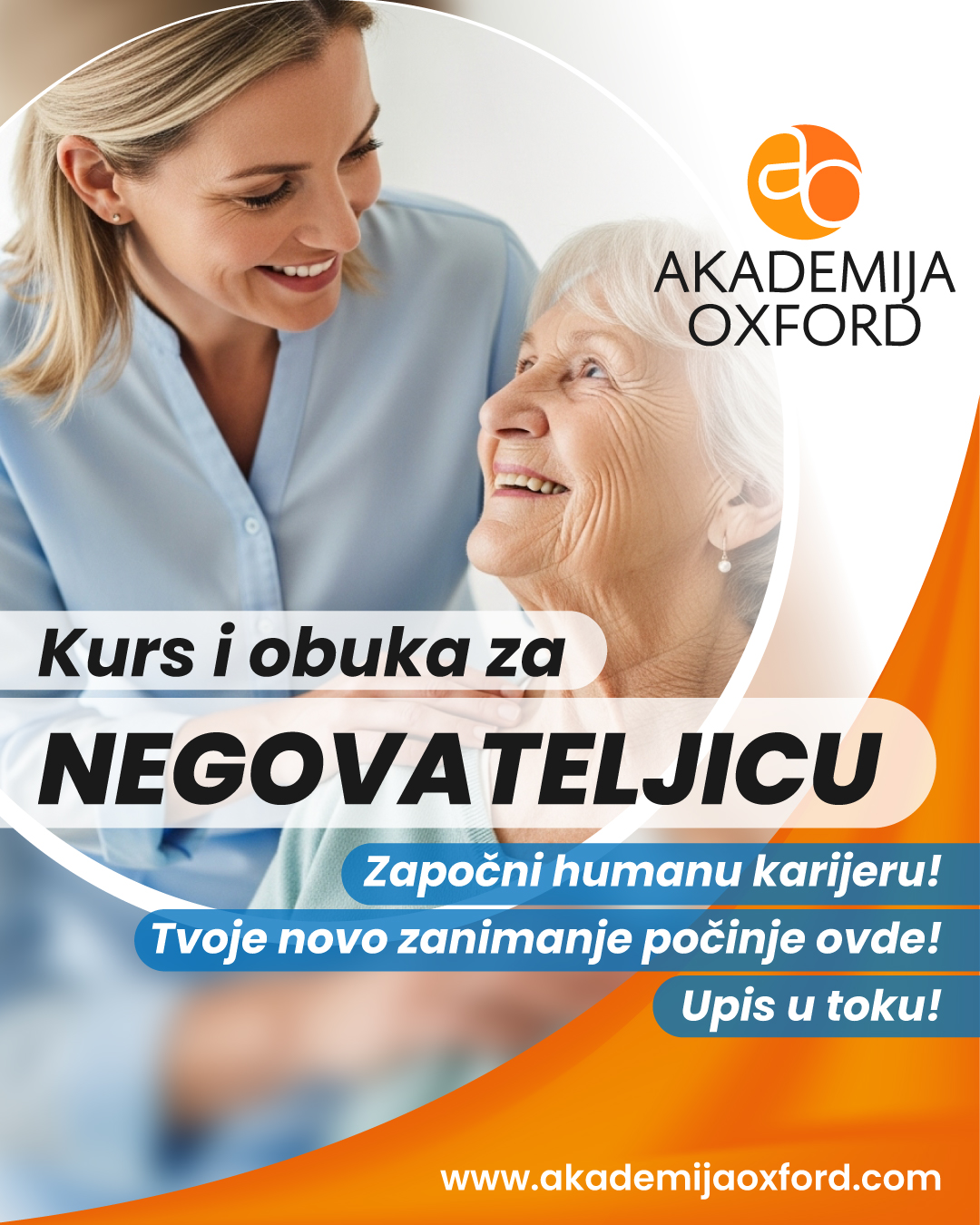 Akademija Oxford, sa čak 38 poslovnica širom zemlje, u svojoj bogatoj ponudi kurseva i stručnih obuka godinama unazad uspešno sprovodi obuku za negovatelja. Obuka je podeljena u dva segmenta – teorijski i praktični deo nakon kog su polaznici obučeni za samostalno obavljanje posla. Traje 240 radnih sati, odnosno 3 meseca, a upis je moguć tokom cele godine.