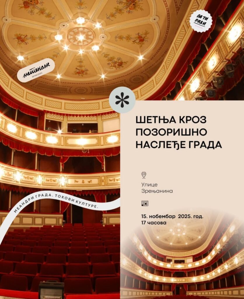 Od priče o prvoj predstavi Marka Jemisejića, improvizovanoj sceni u hotelu „Roza“, liku i delu Toše Jovanovića, do čarolije lutkarstva i doprinosa Šandora Hartiga, ova šetnja oživljava epizode neprekinute tradicije duge 186 godina. Uz neizostavne osvrte na arhitekturu pozorišne sale i razvoj institucionalne scene, šetnja će ponuditi i retke priče iza kulisa – o ljudima, prostorima i idejama koji su oblikovali kulturni identitet grada. Polazište je kod Centralne apoteke, nakon čega grupa obilazi crkvu u Svetosavskoj ulici, Pionirski park, zgradu nekadašnjeg hotela, a šetnja se završava u pozorištu.