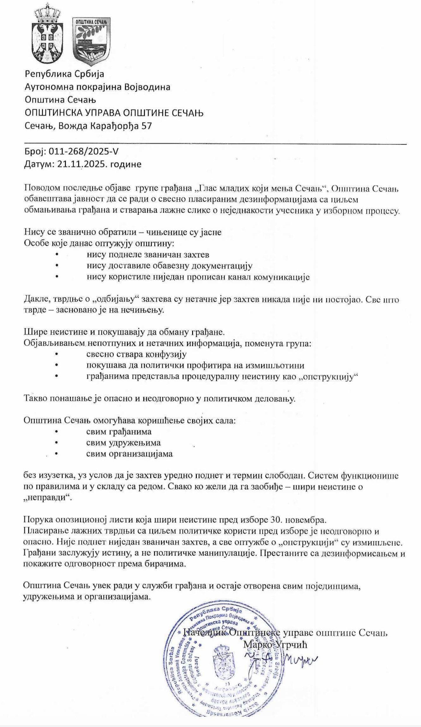 Sečanj- Povodom poslednje objave grupe građana „Glas mladih koji menja Sečanj“, Načelnik Opštinske uprave Sečanj izdao je saopštenje za javnost u kojoj obaveštava da se radi o svesno plasiranim dezinformacijama sa ciljem obmanjivanja građana i stvaranja lažne slike o nejednakosti učesnika u izbornom procesu. Saopštenje prenosimo u celosti.