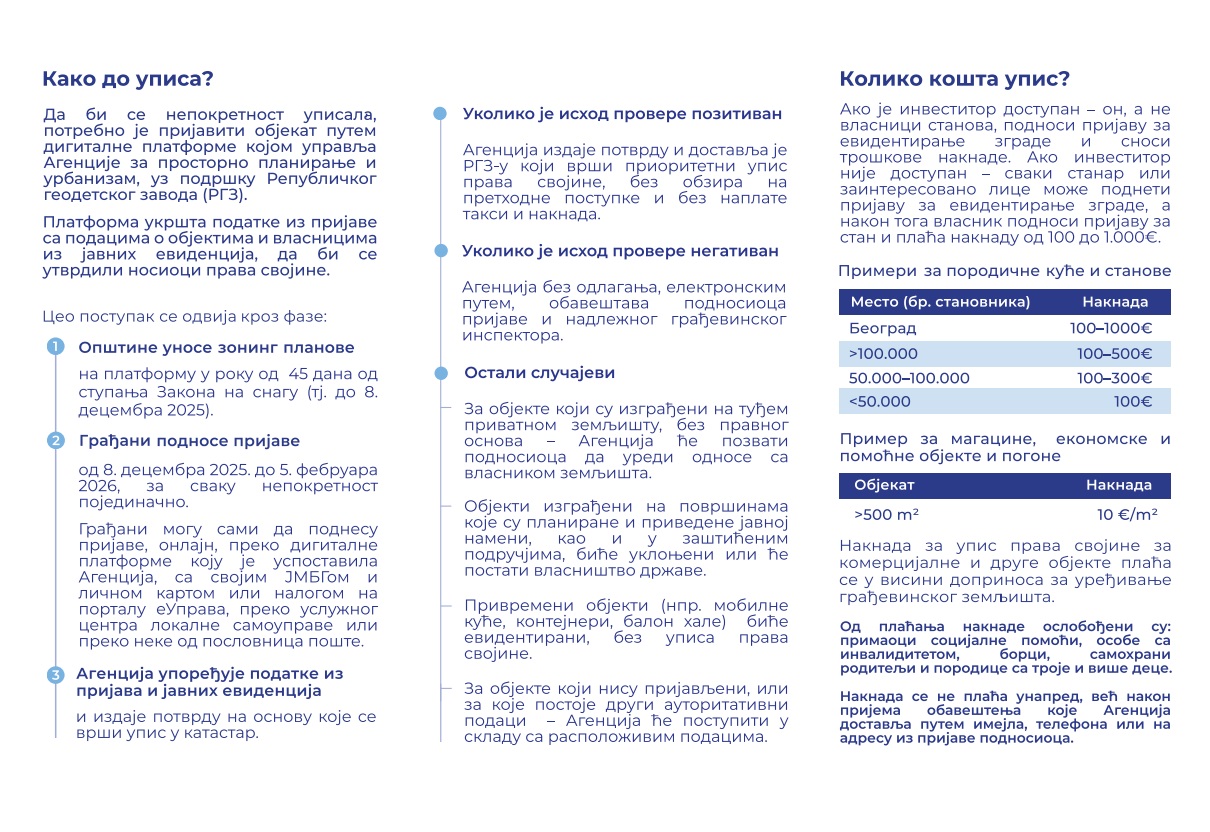Zakon o posebnim uslovima za evidentiranje i upis prava na nepokretnostima koji je stupio na snagu 24. oktobra 2025. godine daje građanima priliku da konačno budu ,,svoji na svome”, registrovani kao vlasnici objekata u kojima žive ili rade, i uspostavlja nultu toleranciju na nelegalnu gradnju.