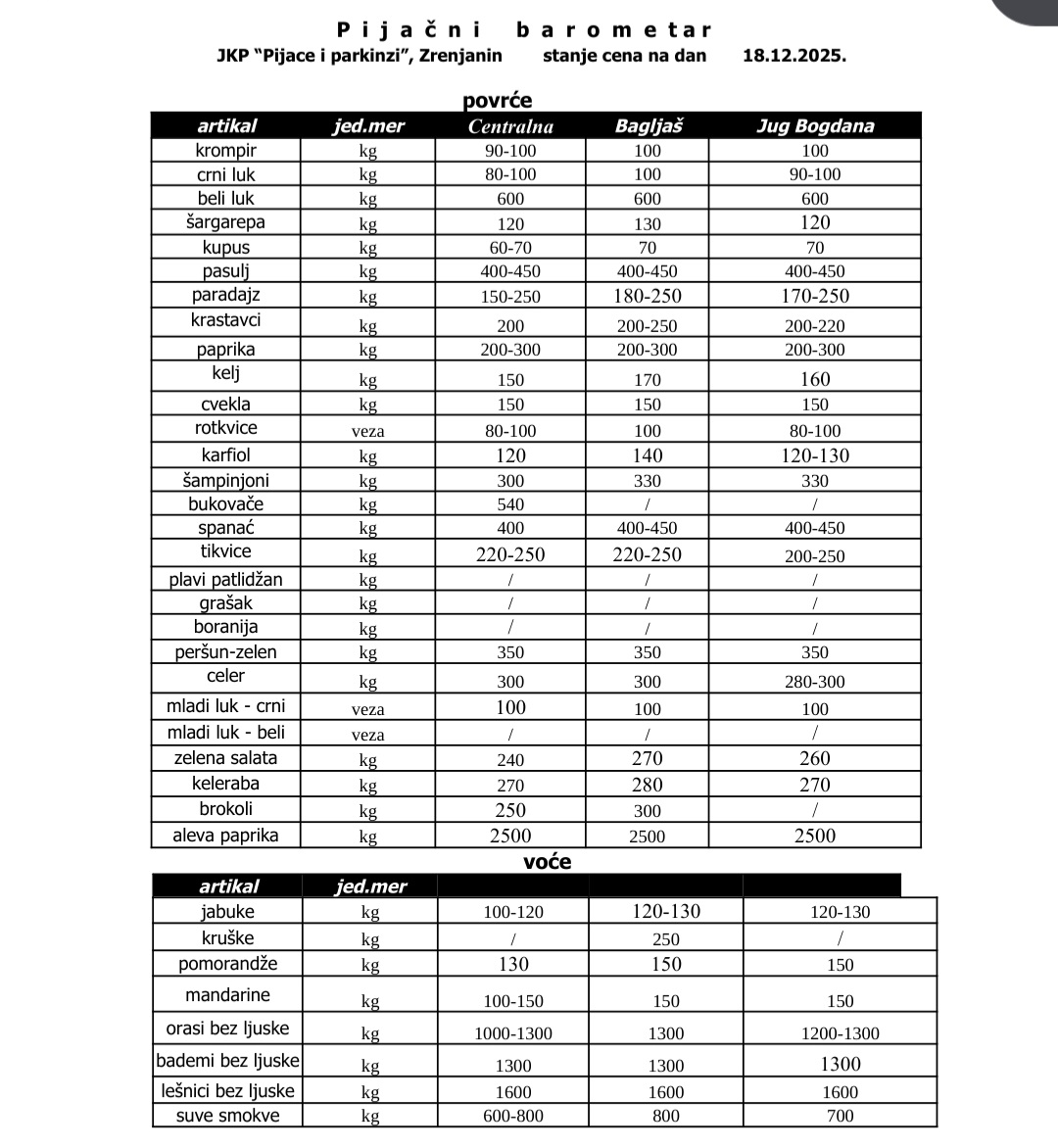Pogledajte cene voća, povrća i mlečnih proizvoda na zrenjaninskim pijacama: