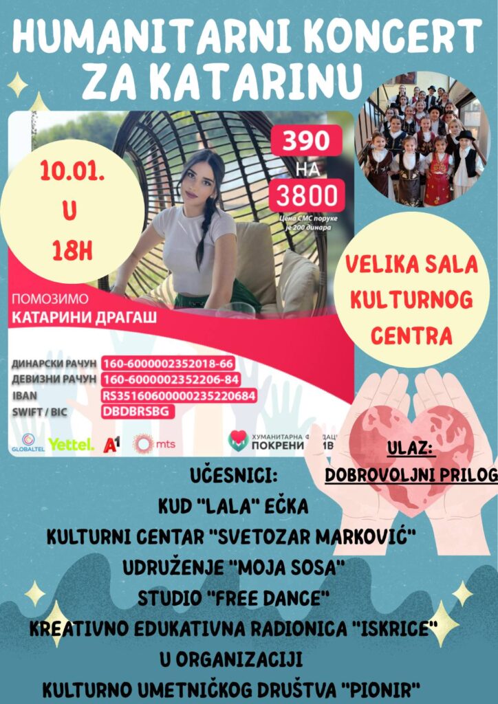 Zrenjanin- U subotu, 10. januara 2026. sa početkom u 18 časova u Kulturnom centru Zrenjanina u organizaciji Kulturno-umetničkog društva GIK „Banat – Pionir“ održaće se humanitarni koncert za mladu Katarinu Dragaš.