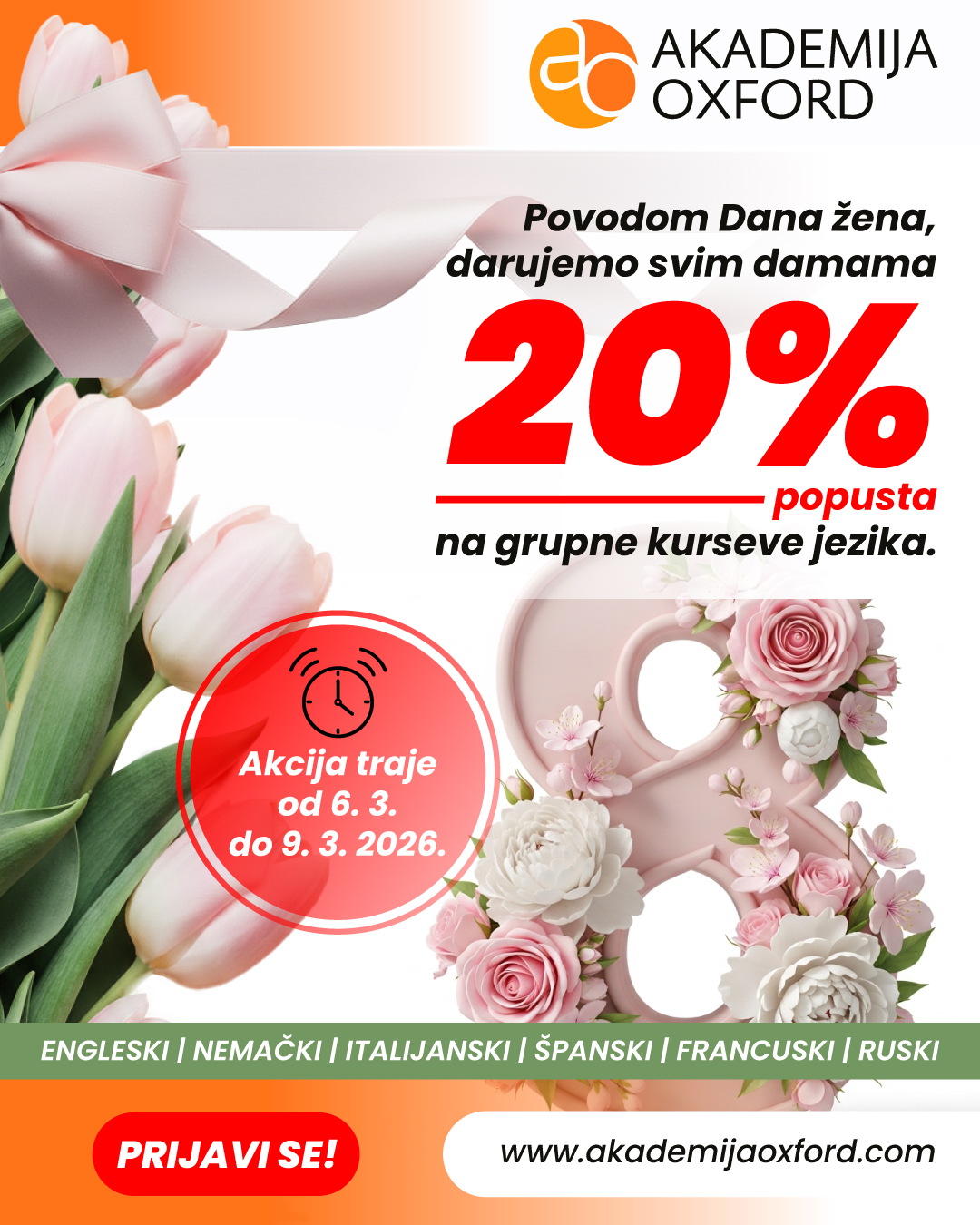 Povodom Dana žena svim damama Akademija Oxford poklanja 20% POPUSTA na upis grupnih kurseva jezika!