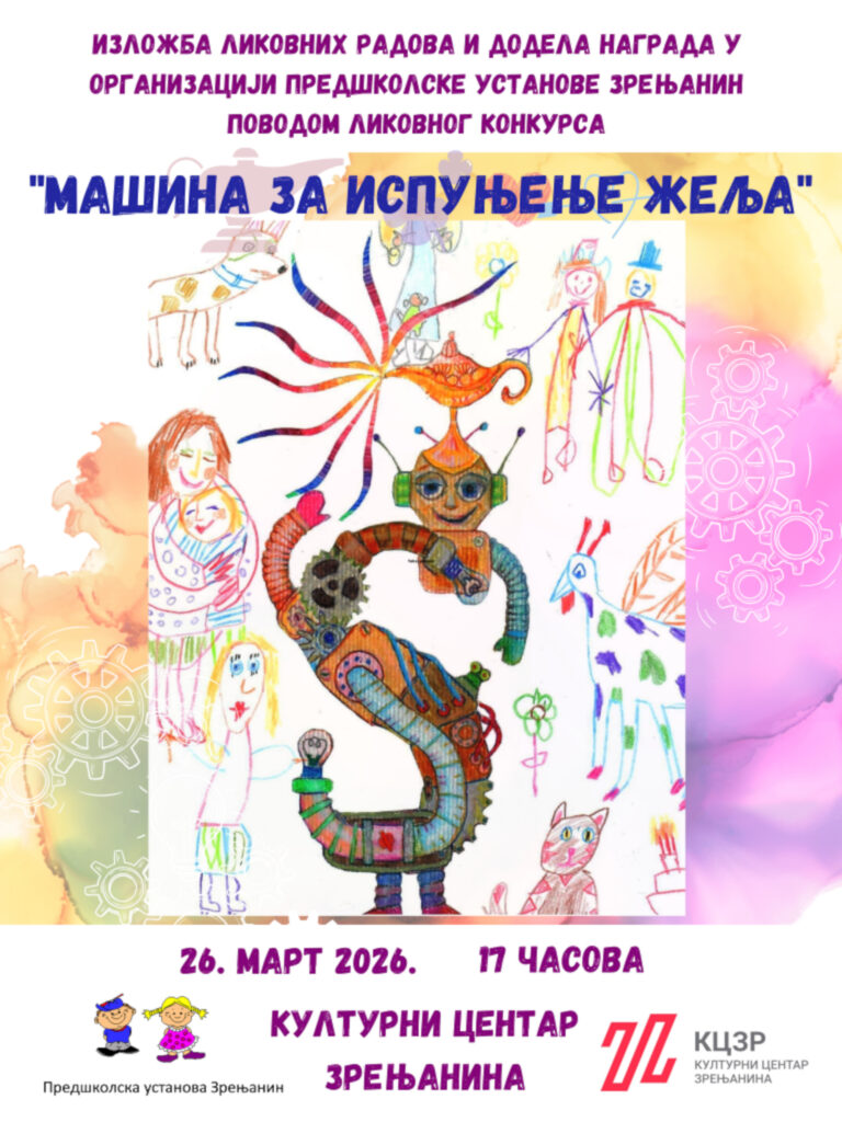 U četvrtak, 26. marta 2026. godine, sa početkom u 17 časova, u Kulturnom centru održaće se izložba likovnih radova i dodela nagrada povodom likovnog konkursa u organizaciji Predškolske ustanove Zrenjanin pod nazivom „Mašina za ispunjenje želja“.