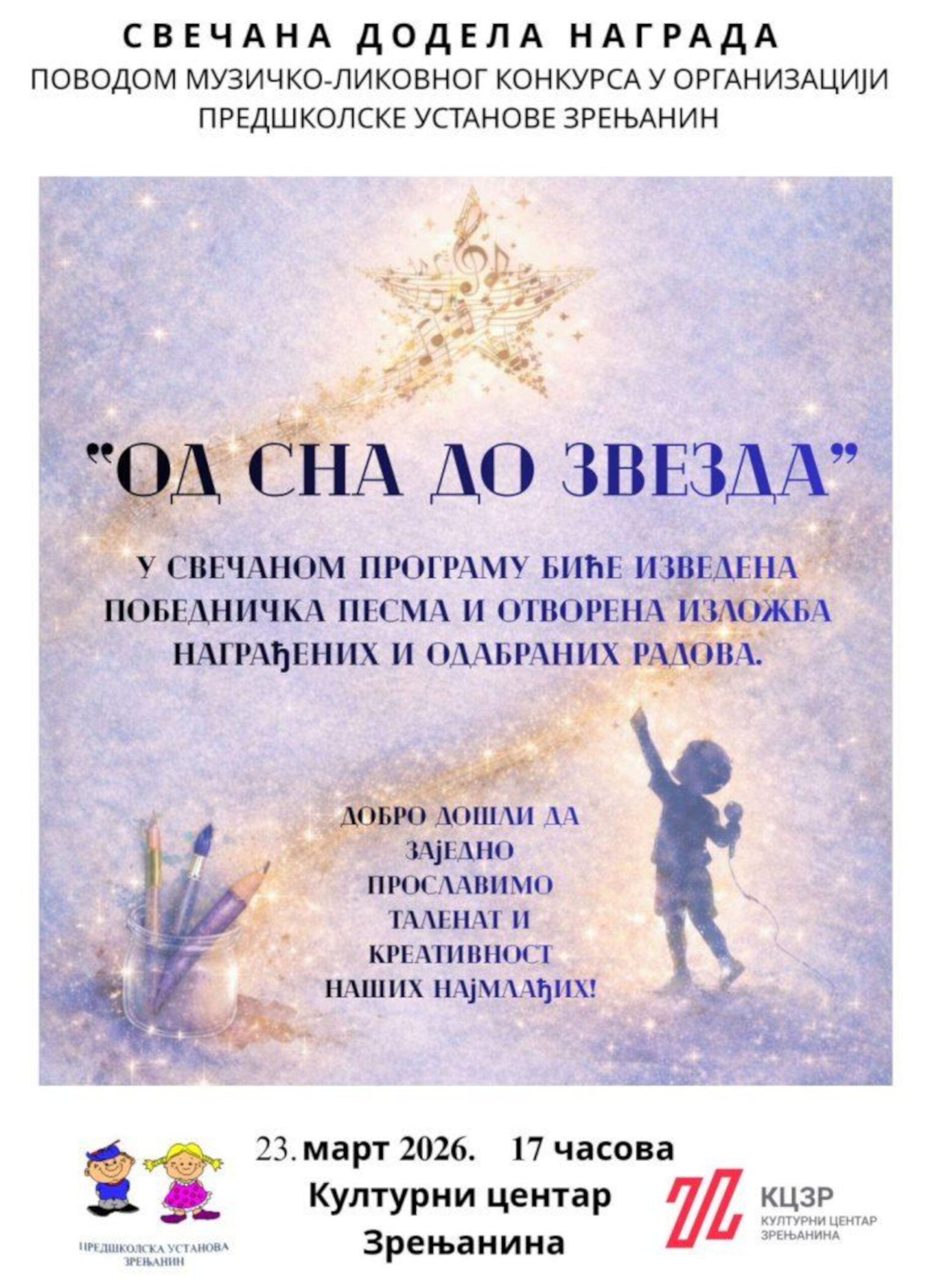 Predškolska ustanova Zrenjanin početkom februara pokrenula je muzičko-likovni konkurs „Od sna do zvezda“, namenjen deci u godini pred polazak u školu.