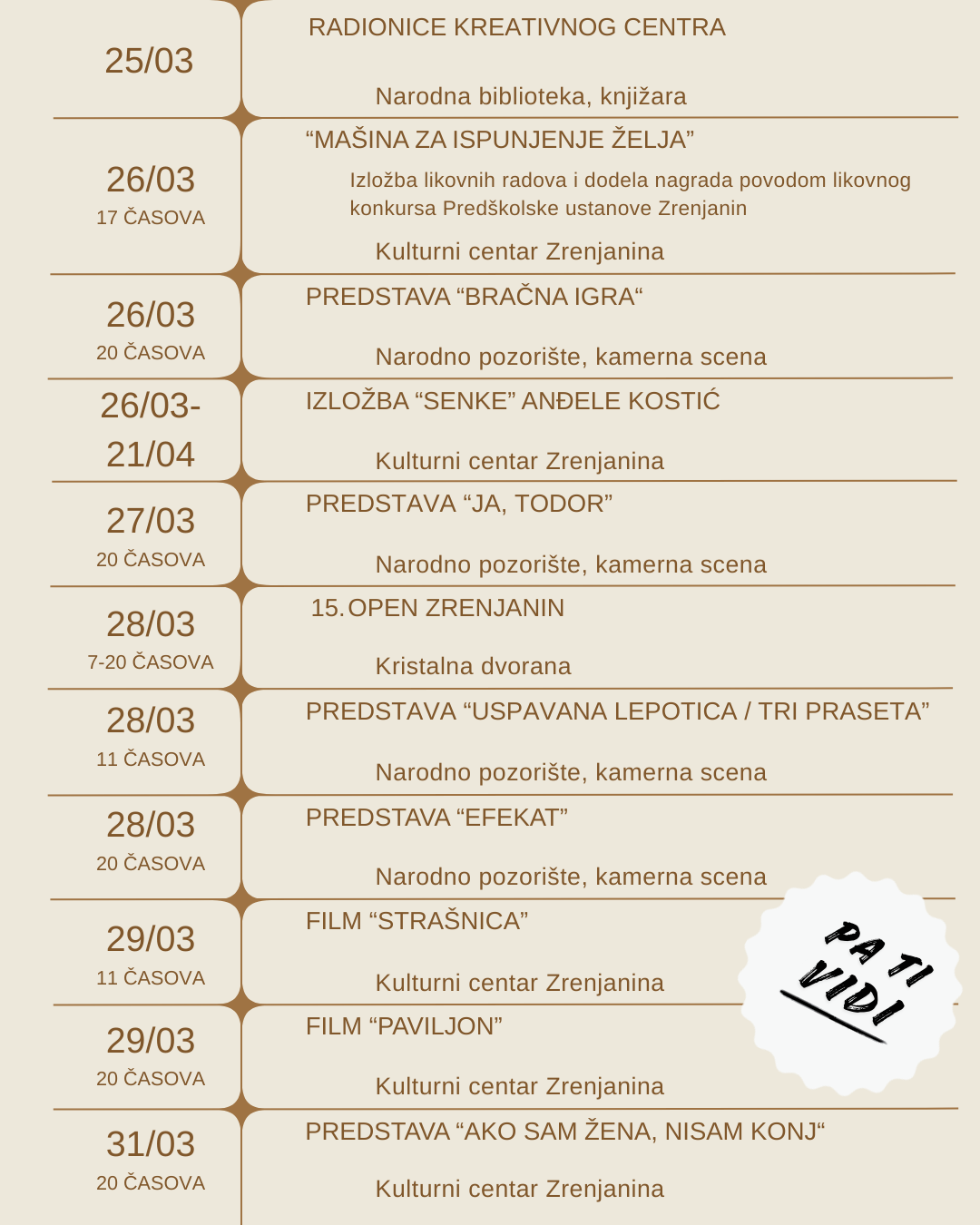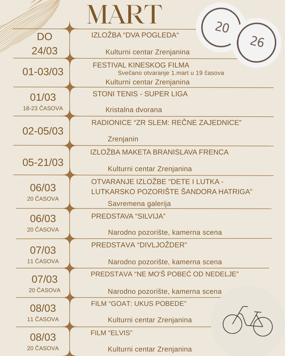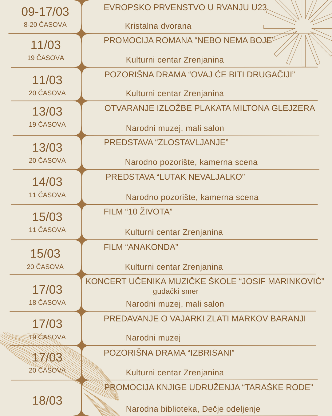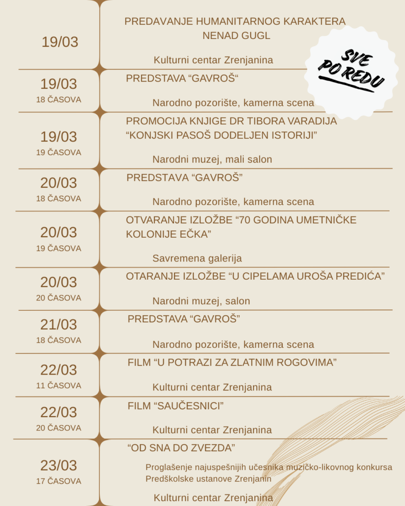 Program kulturnih i sportskih dešavanja u Zrenjaninu do kraja marta 10.03.2026. | Vesti | 0 | Do kraja marta zrenjaninsku publiku očekuju izložbe, pozorišne predstave, filmske projekcije, promocije knjiga, koncerti, sportska takmičenja, kao i brojni kulturni događaji. Pogledajte kulturna i sportska dešavanja u Zrenjaninu tokom marta: