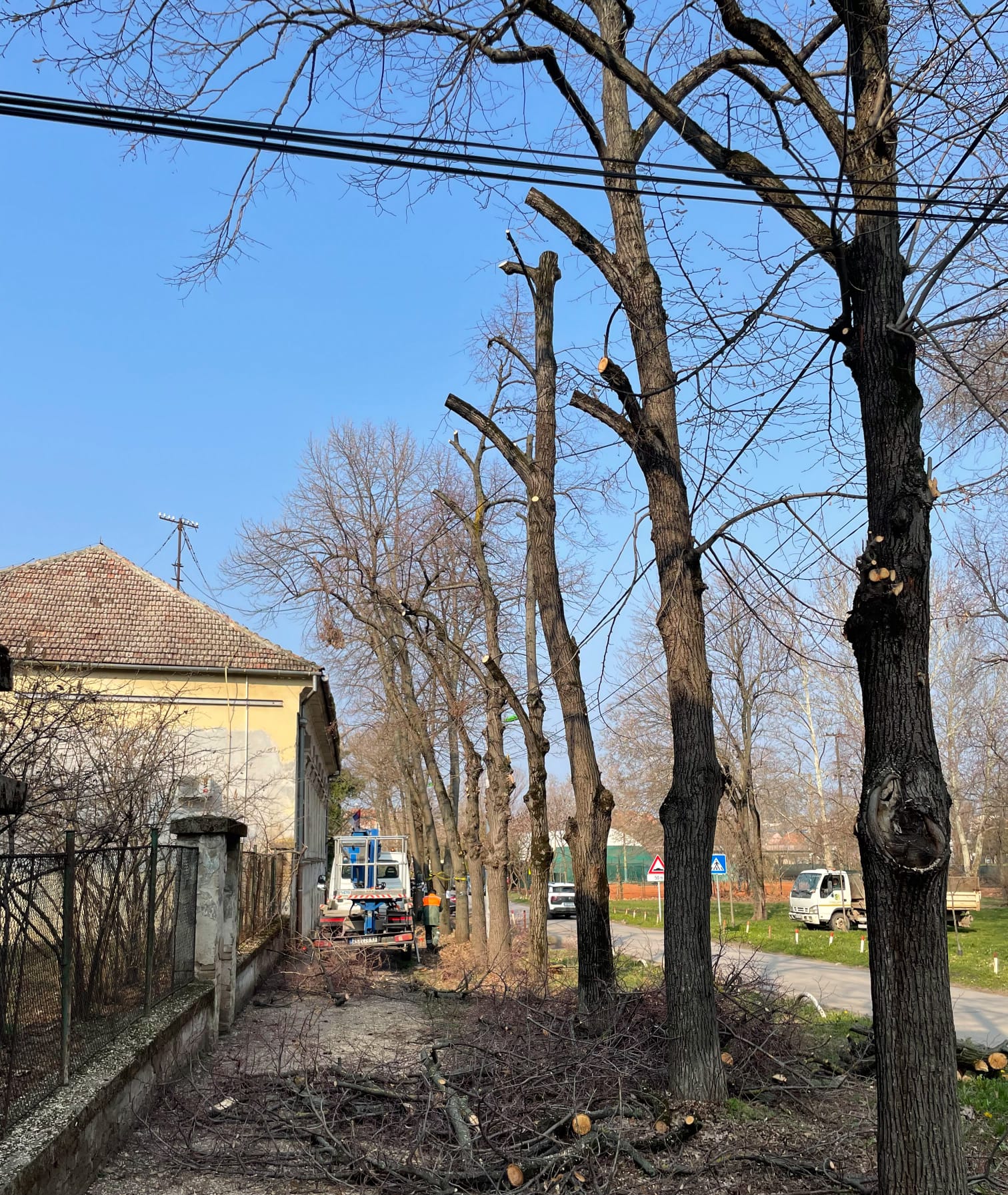 Seča grana na stablima izvršena je na mestima gde su grane došle u kontakt sa električnim vodovima, odnosno gde su predstavljale potencijalnu opasnost za objekte (prozore i krovove zgrada), kao i za parkirana vozila.