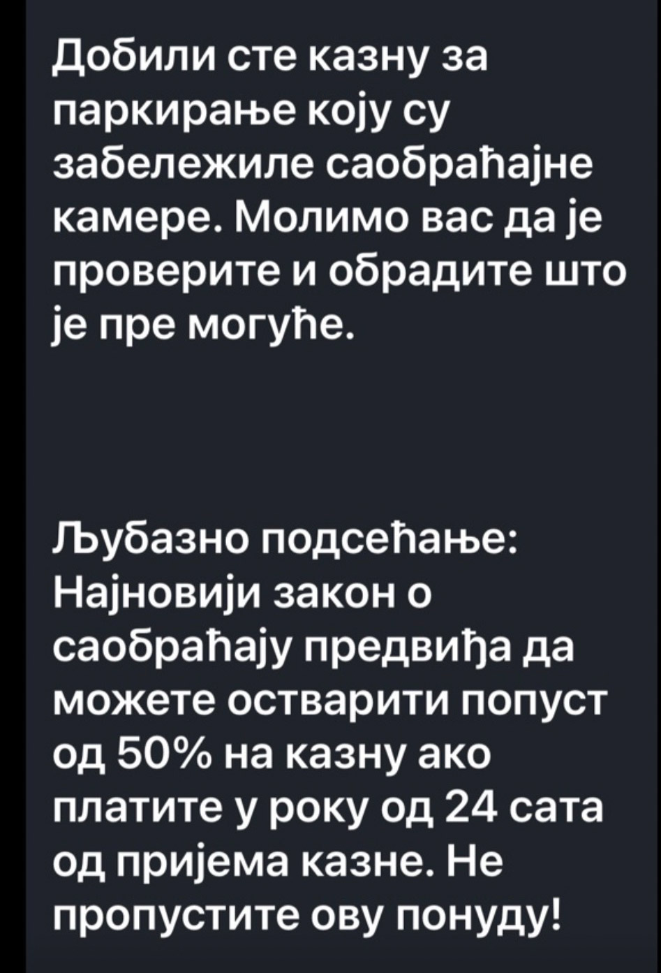 Vesti- Kako nam je saopšteno iz PR službe JKP „Pijace i parkinzi“ danas su mnogi građani putem sms poruke dobili obaveštenje u kojoj im je rečeno da su dobili kaznu za parkiranje koju su zabeležile saobraćajne kamere i uputstvo kako da izvrše uplatu.