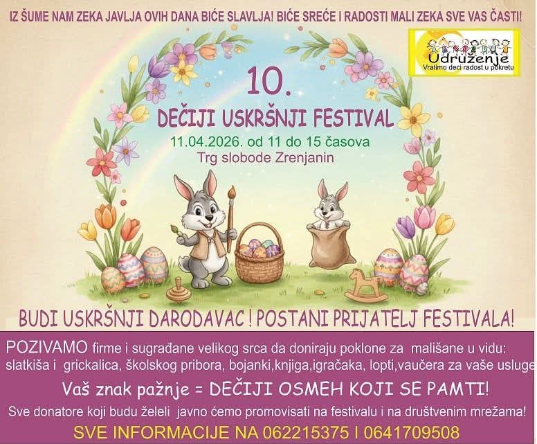 Zrenjanin- 10. Dečiji uskršnji festival, namenjen najmlađima i njihovim porodicama biće održan u subotu, 11. aprila na Trgu slobode. Manifestacija će trajati od 11 do 15 časova uz bogat program ispunjen igrom, osmesima i prazničnom atmosferom.